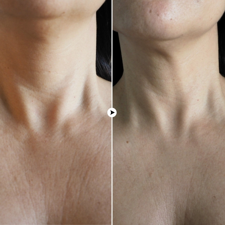 The neck and chest area appears more even, with a youthful radiant glow. Improvement in skin texture, elasticity and firmness. Cell activity is increased, skin’s natural water barrier is restoring.